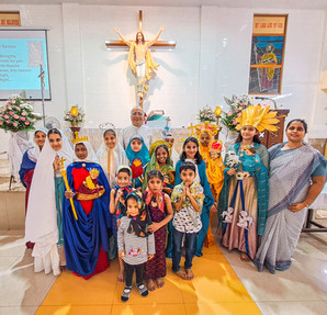 This year, the Sunday school, under the guidance of Fr. Leslie Almeida, took on the responsibility of Novena Preparation and Liturgy. The children actively participated in Mass liturgy and the choir, with ten girls (including the feast day) having the opportunity to portray themselves as Mother Mary. With the support of each child's mother, we were able to recreate different attire representing Our Lady. The girls displayed immense enthusiasm, interest, and devotion as they walked in the procession during the entrance hymn over the nine days of the Novena.